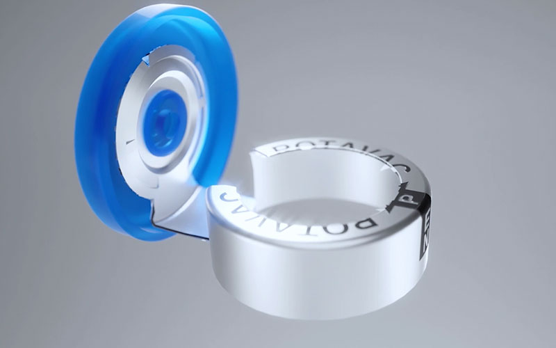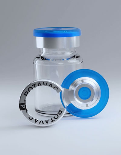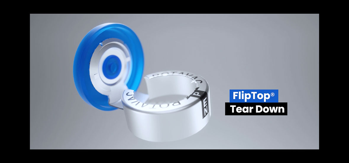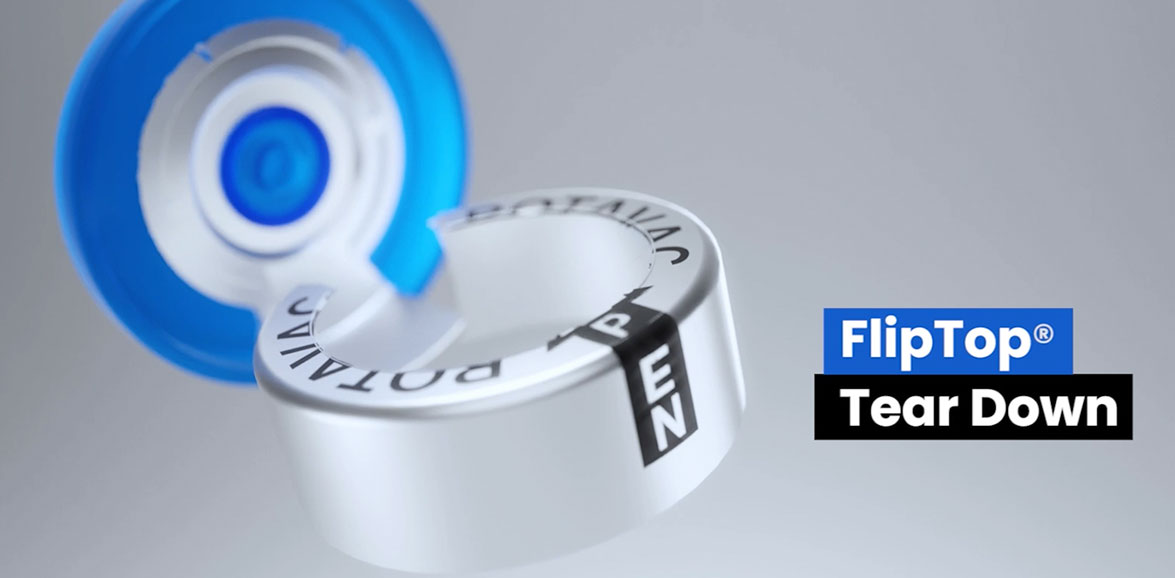 The PP disc of the FlipTop® Tear Down seals is flipped open and torn down along the side groove to access the injectable medicine.